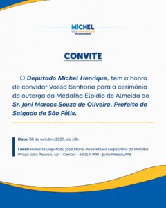 📌 A honraria foi concedida por iniciativa do deputado estadual Michel Henrique, em reconhecimento aos relevantes serviços prestados pelo gestor ao desenvolvimento do município de Salgado de São Félix e ao fortalecimento das políticas públicas locais.